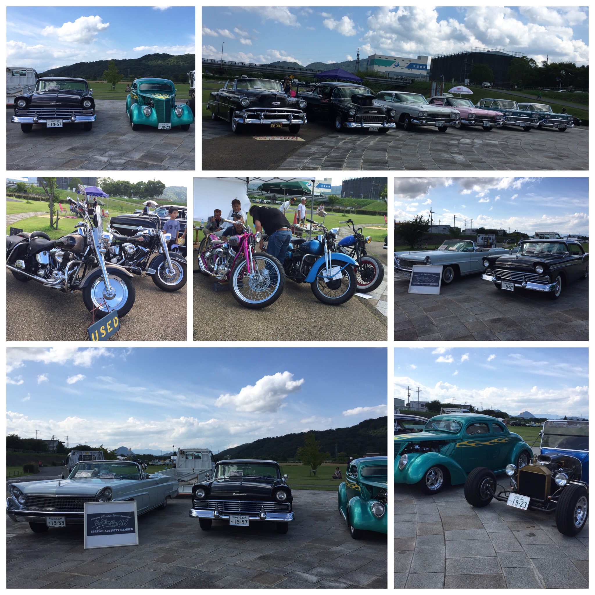 相談ブース、50'sのアメ車.カスタムハーレーの展示、